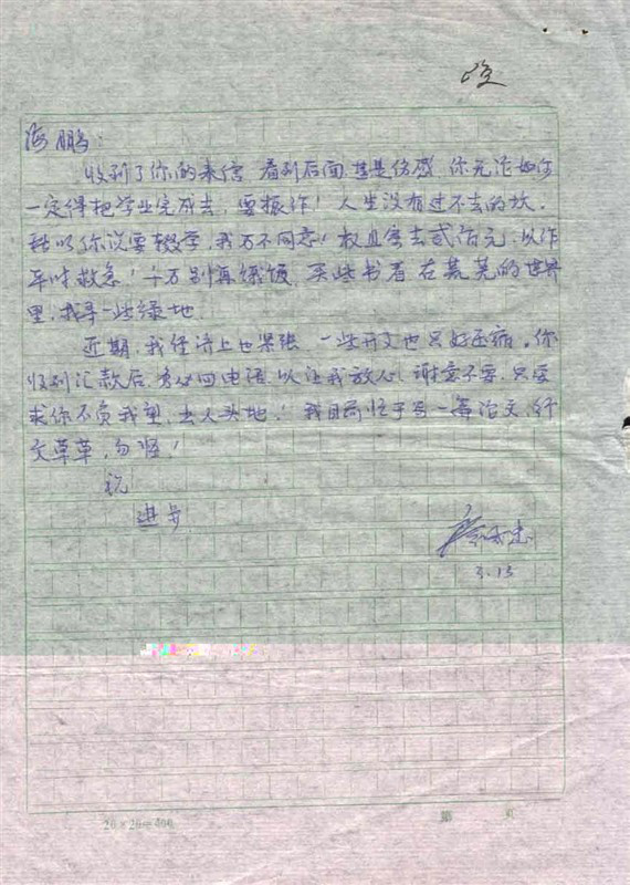 我們學(xué)校是屬于五年制的高職大專,我在大學(xué)里讀了四年,最后一年因?yàn)榧彝ズ蛡€(gè)人追求多方面原因棄學(xué)創(chuàng)業(yè)從事了個(gè)人站長(zhǎng)事業(yè),在輟學(xué)之前,廖老師知道我想法,規(guī)勸我萬(wàn)萬(wàn)不可放棄學(xué)業(yè),并匯了兩百元給到我,現(xiàn)在我還保存有當(dāng)年他寫(xiě)給我的書(shū)信,當(dāng)中說(shuō)“謝意不要,只要求你不負(fù)我望,出人頭地”。但是最終我還是放棄了學(xué)業(yè),主動(dòng)申請(qǐng)了退學(xué),假如當(dāng)時(shí)后從此一直默默無(wú)聞,泯然眾人矣,則定然負(fù)其所望,汗顏無(wú)地,所以我把這次棄學(xué)當(dāng)做是破釜沉舟、背水一戰(zhàn),一直謹(jǐn)記在心,念念不忘,一定要出人頭地,叫生當(dāng)作人杰,死亦為鬼雄!